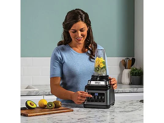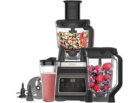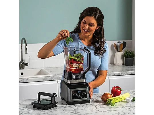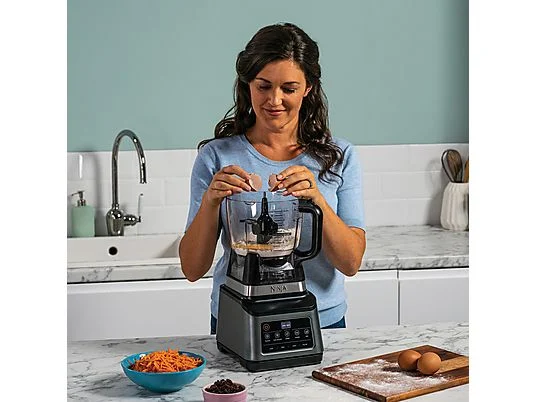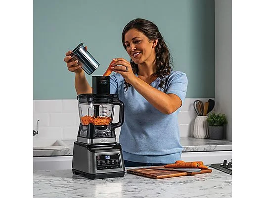 Con el procesador de alimentos BN800EU de Ninja tendrás 3 aparatos de cocina en 1: es un procesador de alimentos, pero también es una batidora de vaso con jarra grande y una batidora de vaso individual portátil. Es el mejor pinche de cocina que te puedas imaginar: te ayuda en la cocina en tus preparaciones desde masas para pan y postres, hasta gazpachos, cremas frías o salsas, pasando por cualquier bebida fría.